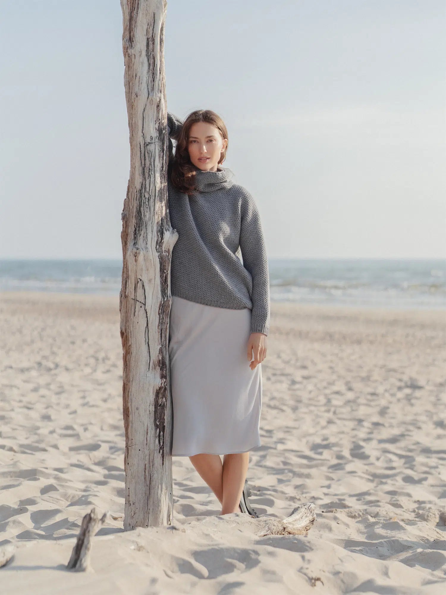 Crafted from incredibly soft merino and cashmere wool yarns, this sweater effortlessly combines comfort and style, making it a versatile companion for jeans or skirts. Featuring full-length sleeves and a snug neck, it feels like a second skin, embodying the essence of simplicity and sophistication.