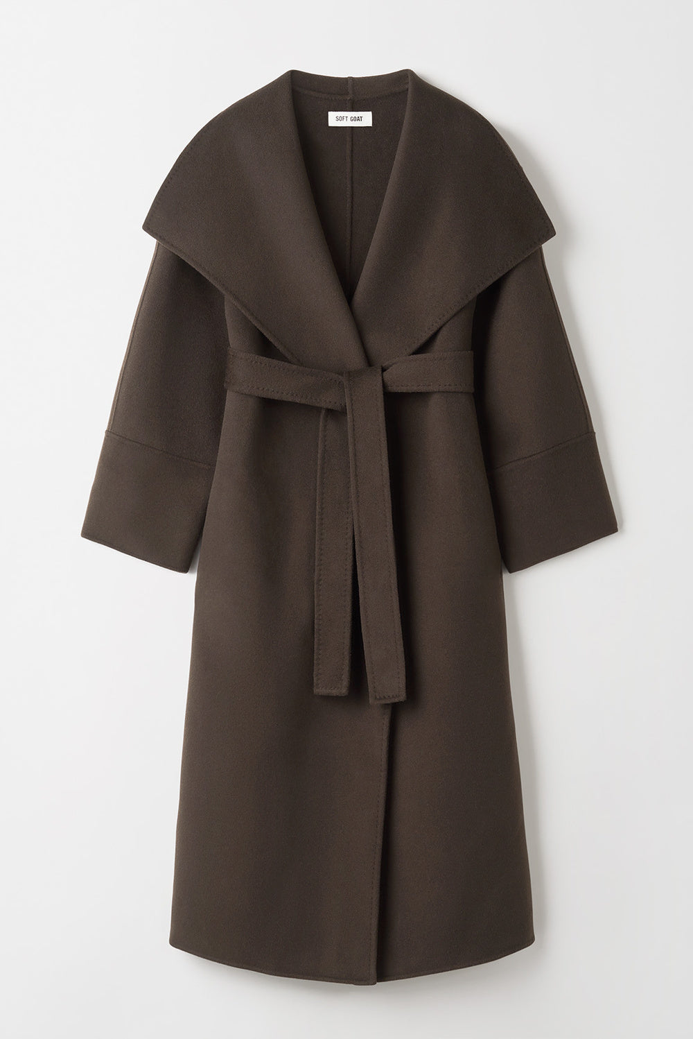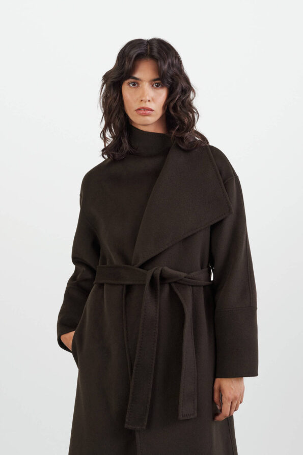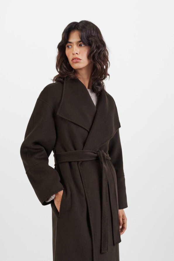 Woven long coat with a shawl neck and belt in a wool and cashmere blend.