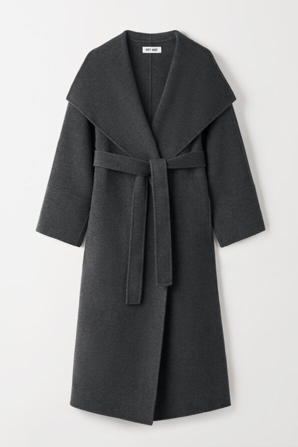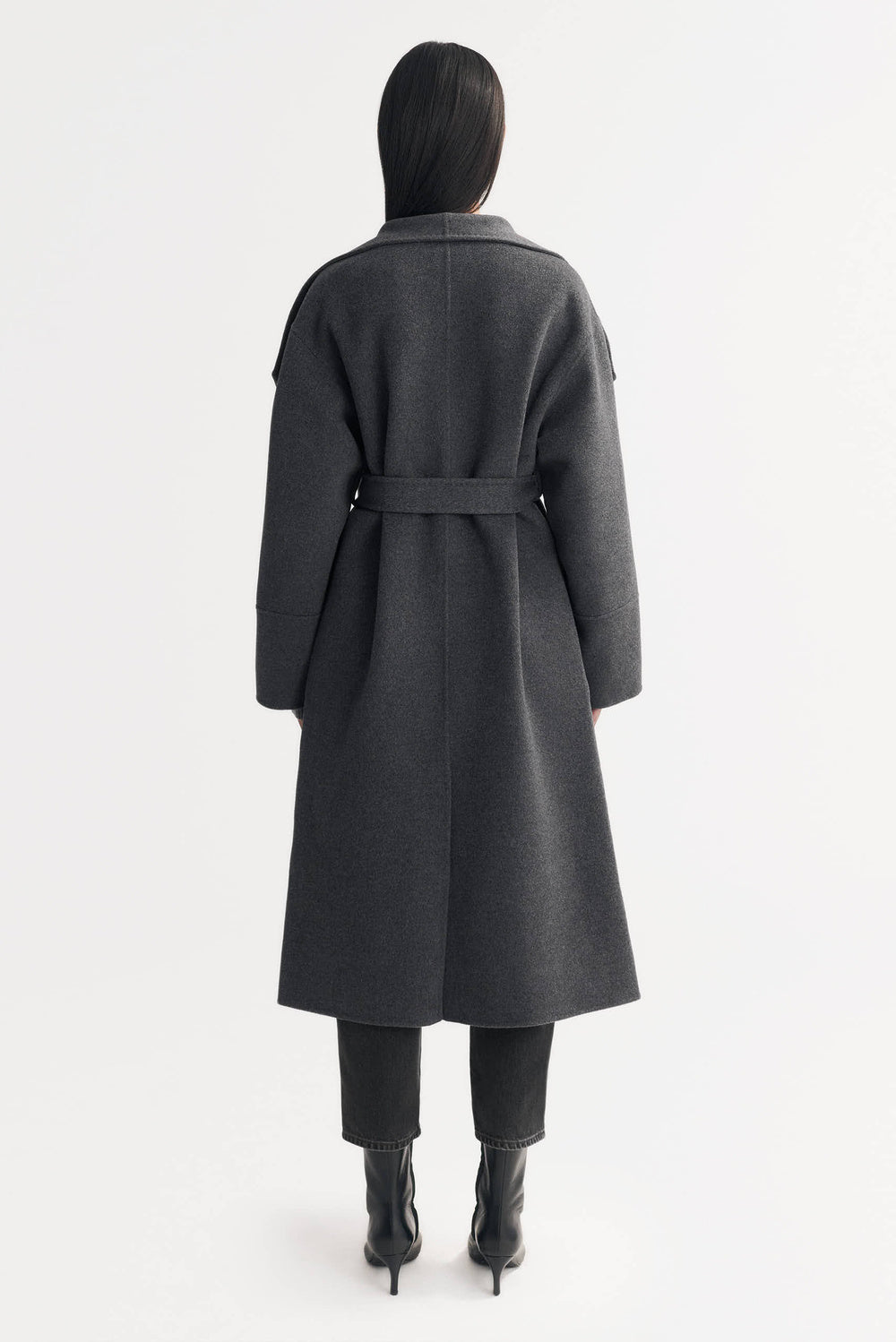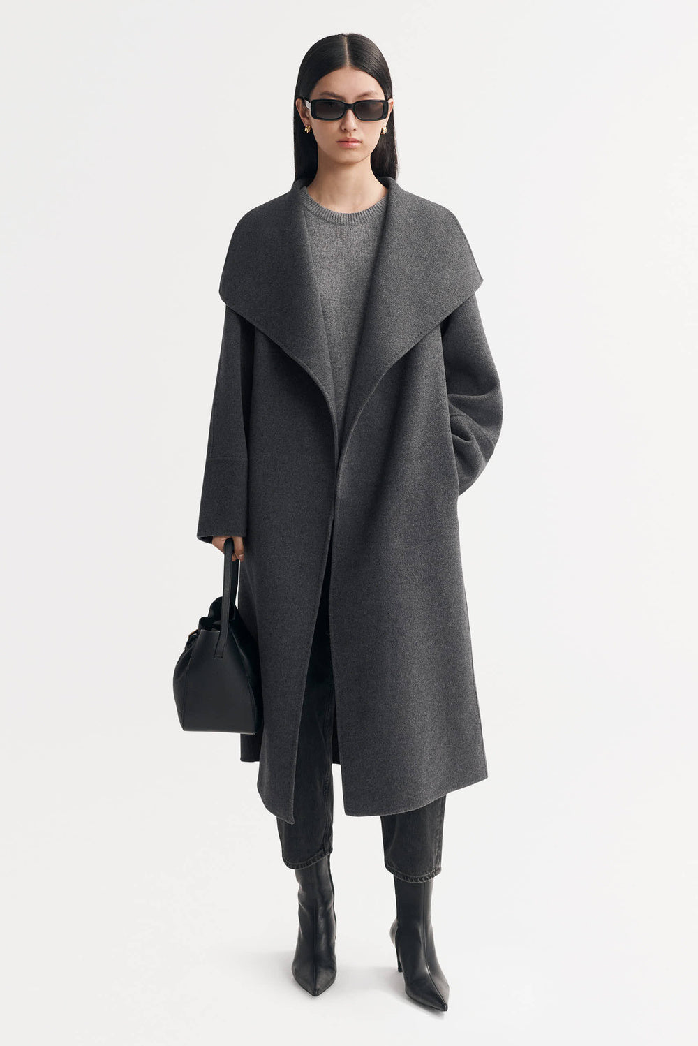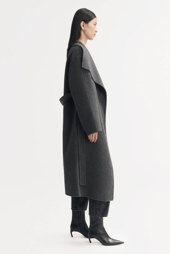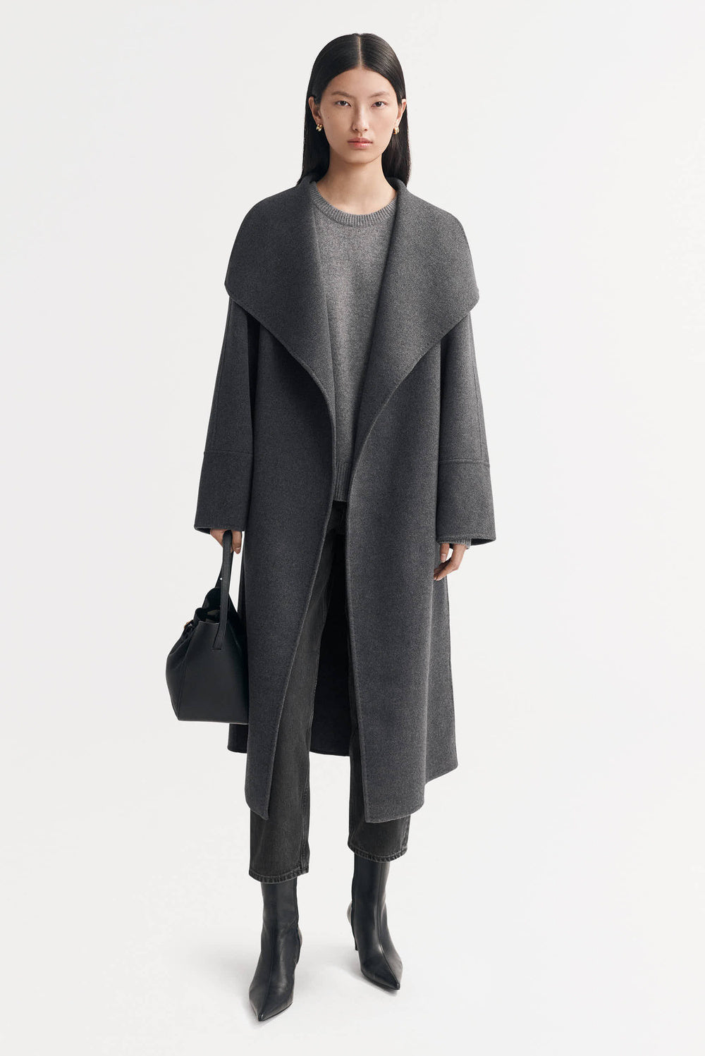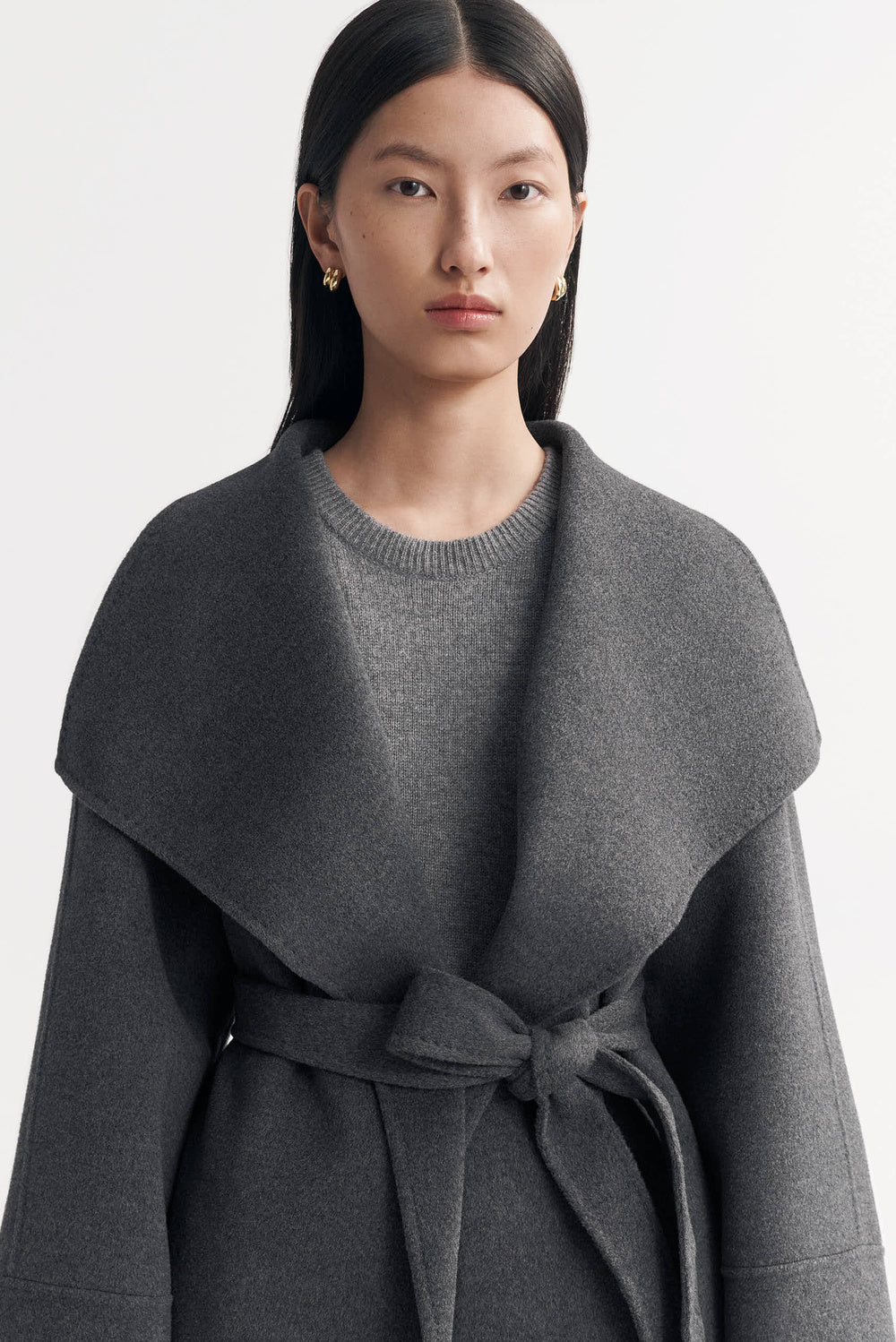 Woven long coat with a shawl neck and belt in a wool and cashmere blend.