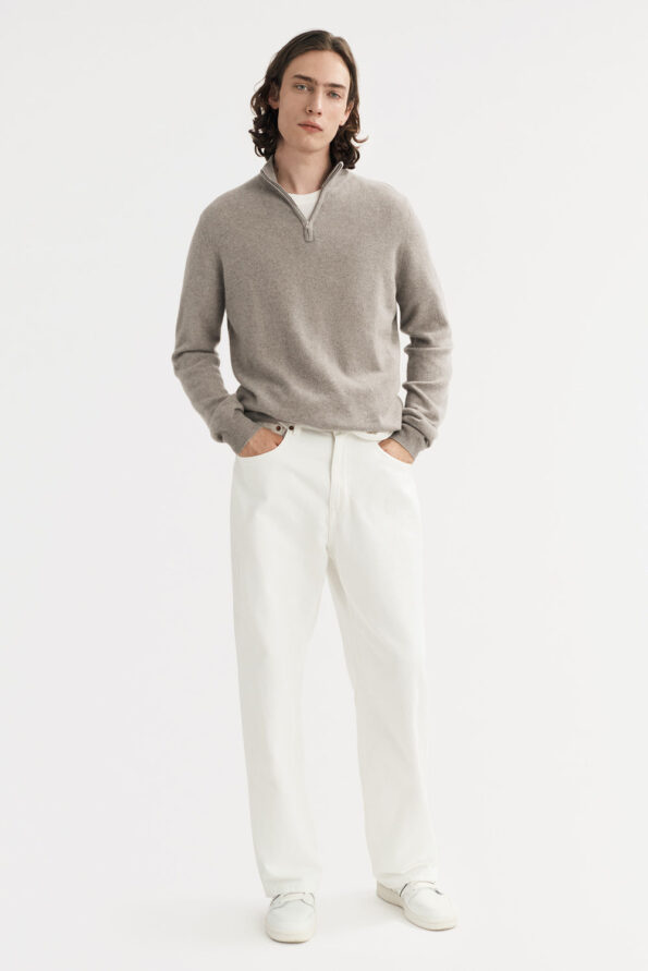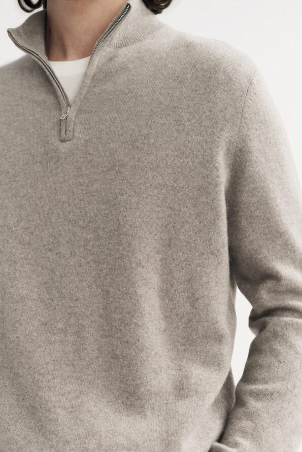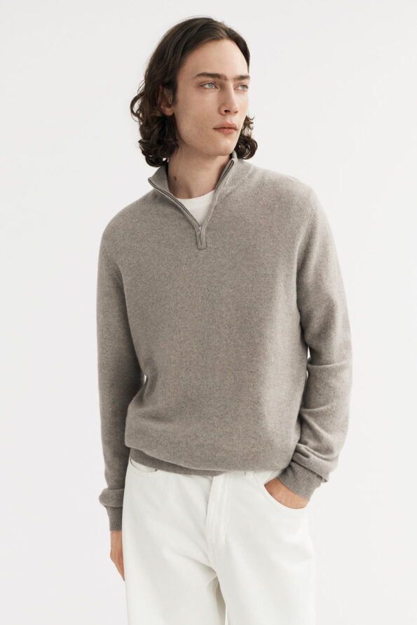 Men’s fine knit sweater with half zip in 100% cashmere.