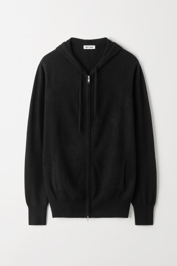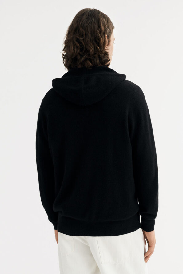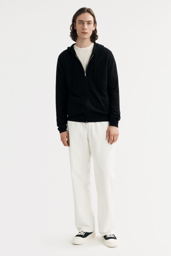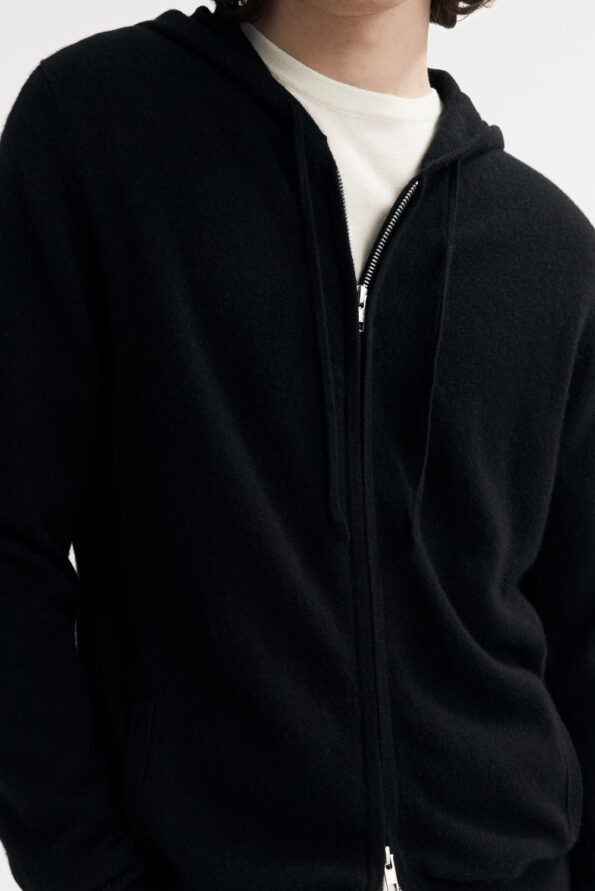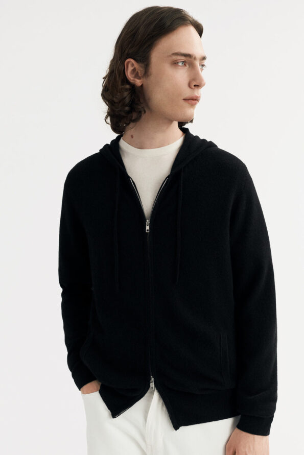 Men’s fine knit hoodie with zipper in 100% cashmere.