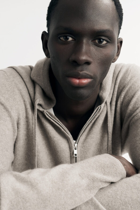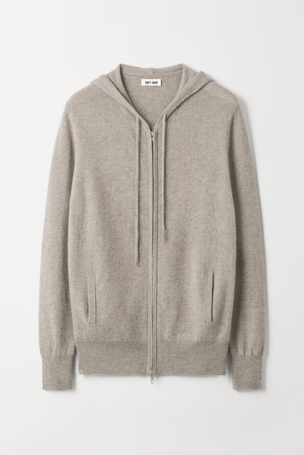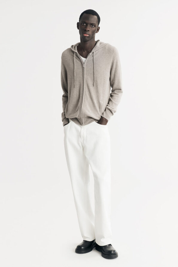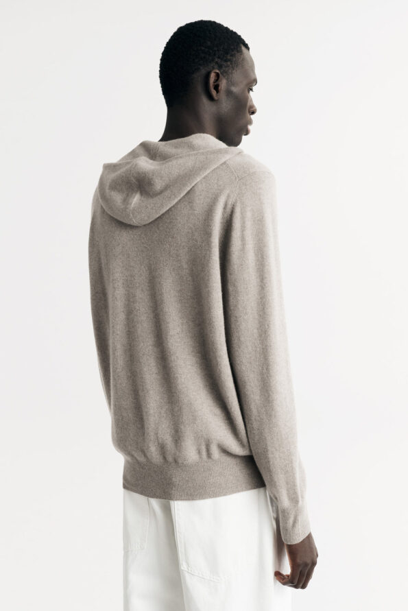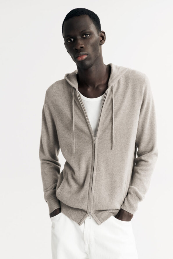 Men’s fine knit hoodie with zipper in 100% cashmere.