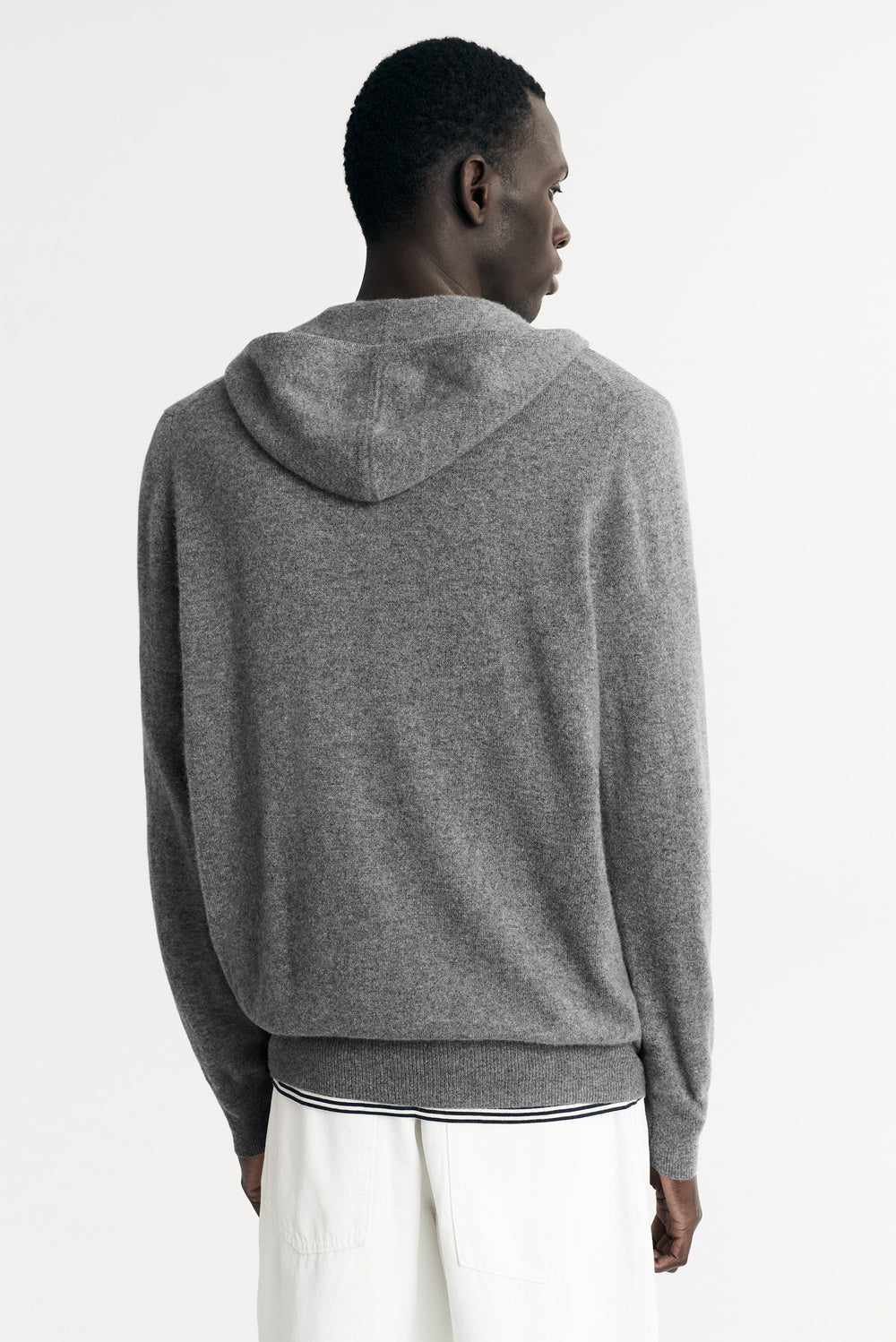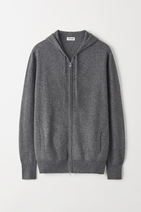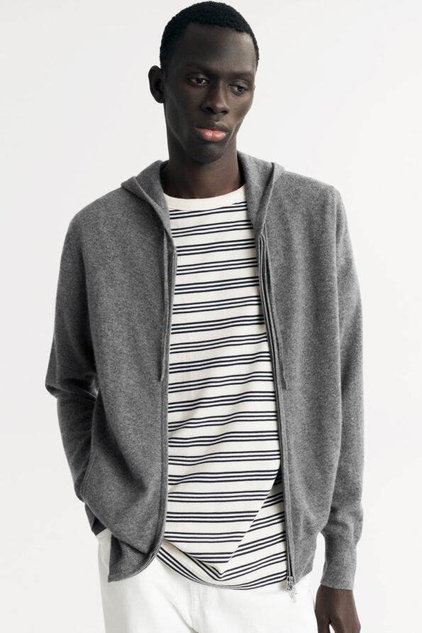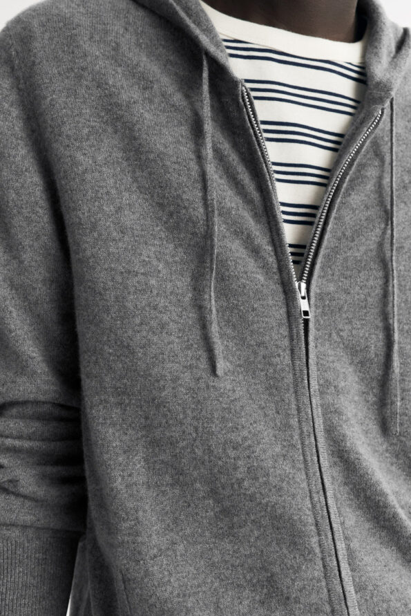 Men’s fine knit hoodie with zipper in 100% cashmere.