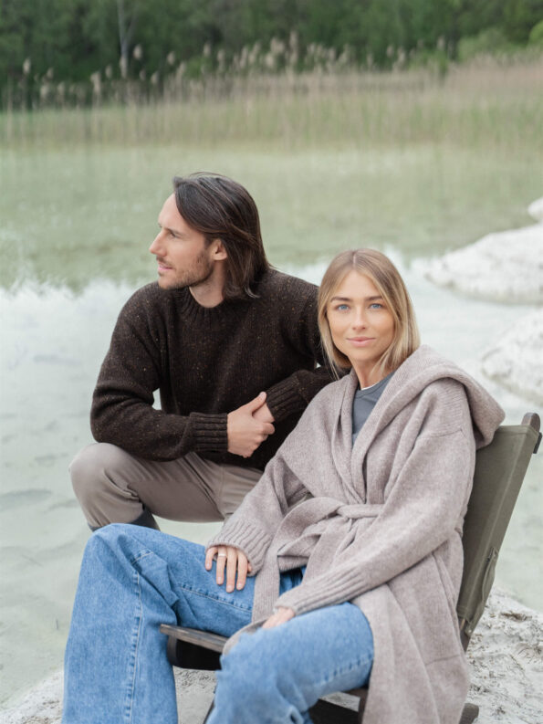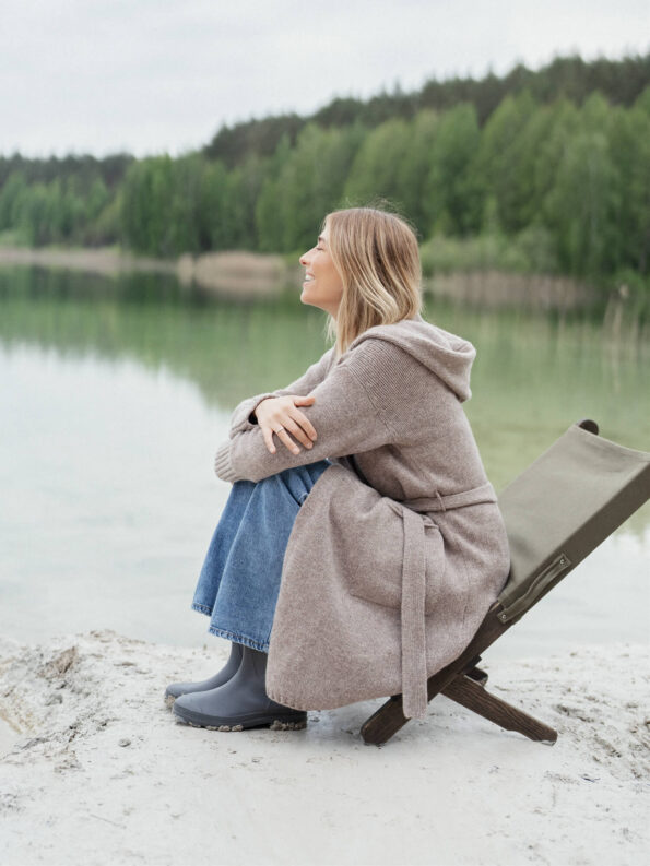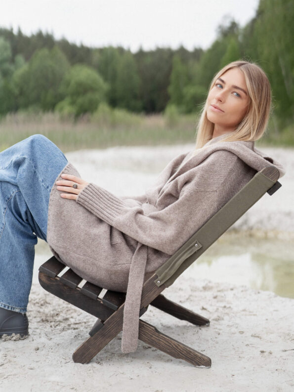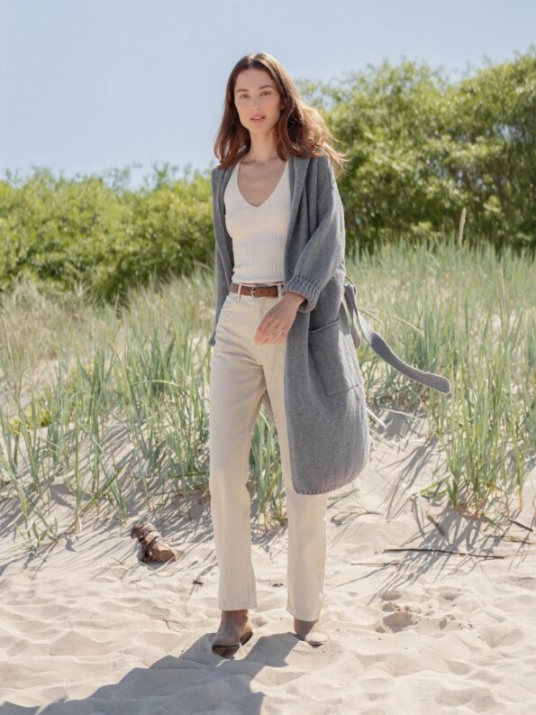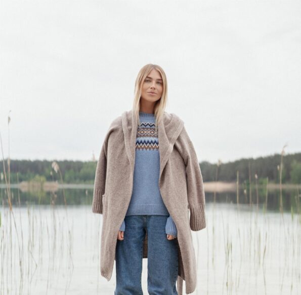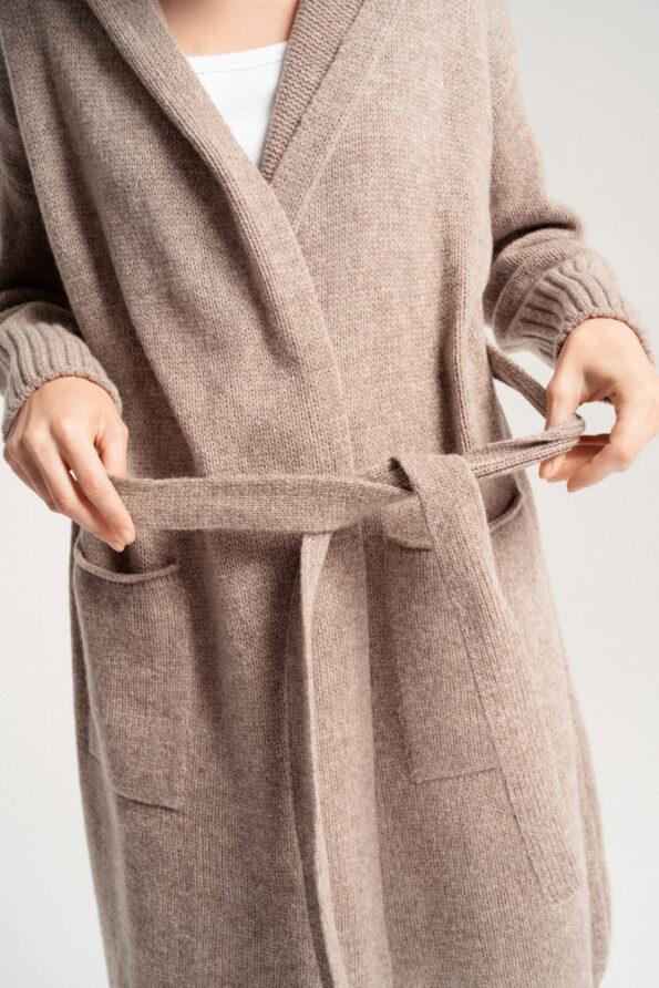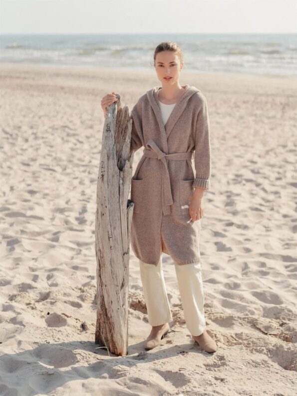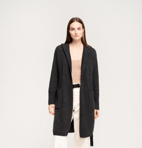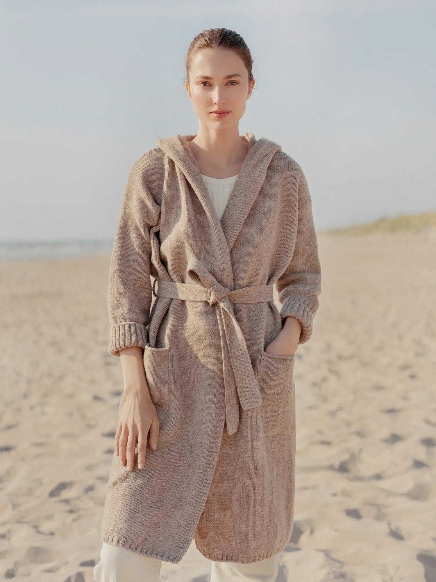 This long cardigan features a stylish hood, adding a touch of sophistication to any outfit. Also this high-quality women’s cardigan boasts two comfortable patch pockets, adding practicality to its timeless elegance. Whether you’re embracing the crisp air of autumn or the gentle breeze of spring, this woolen cardigan effortlessly adapts to all seasons and occasions.?Crafted with exquisite merino and cashmere yarns, this hand-knitted masterpiece ensures the perfect balance between warmth, comfort and breathability.