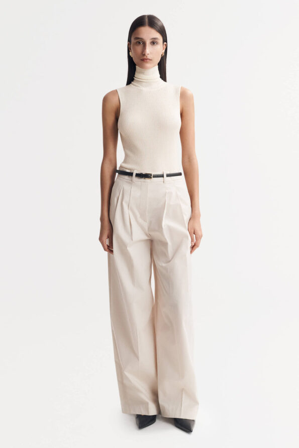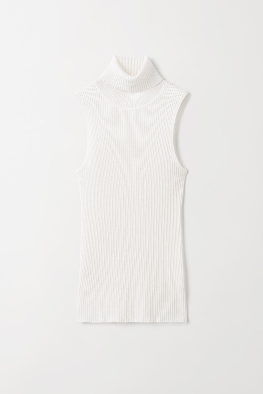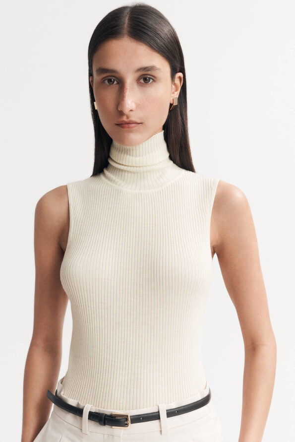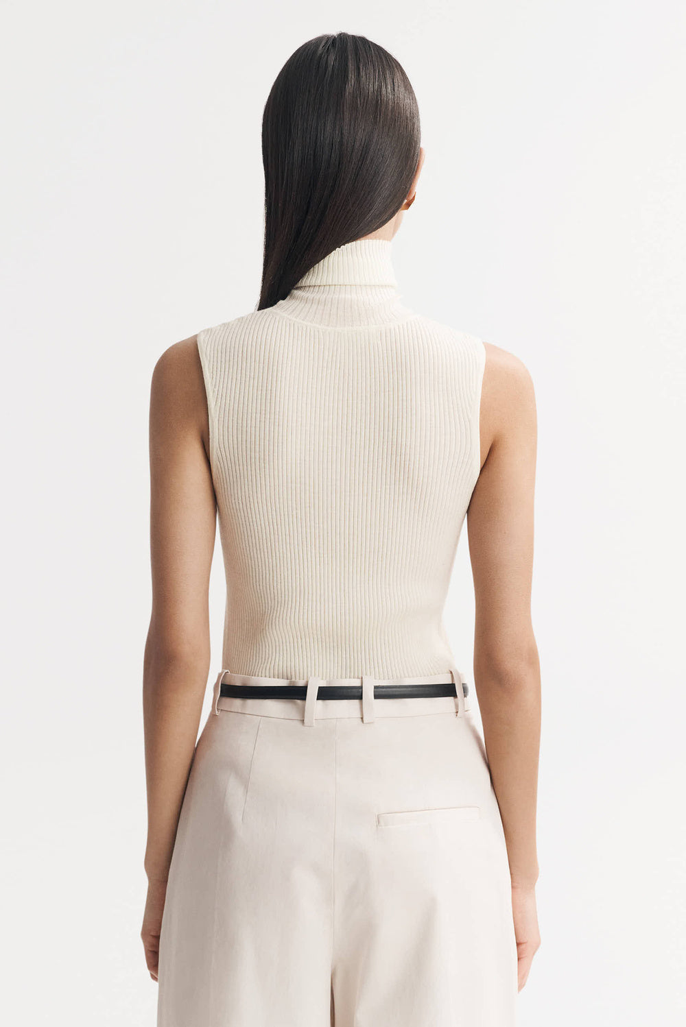Sleeveless ribbed knit singlet with turtleneck in 100% wool.