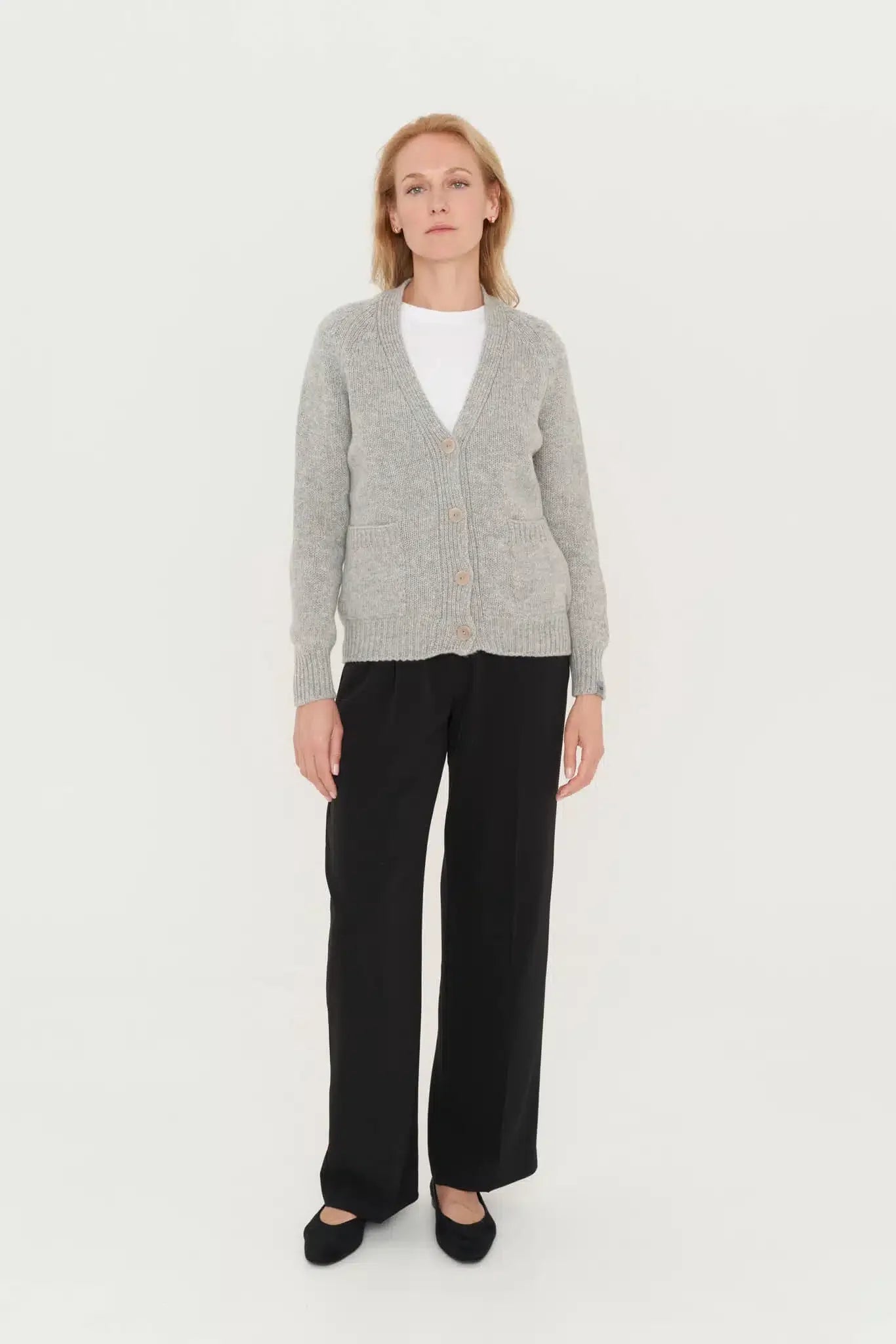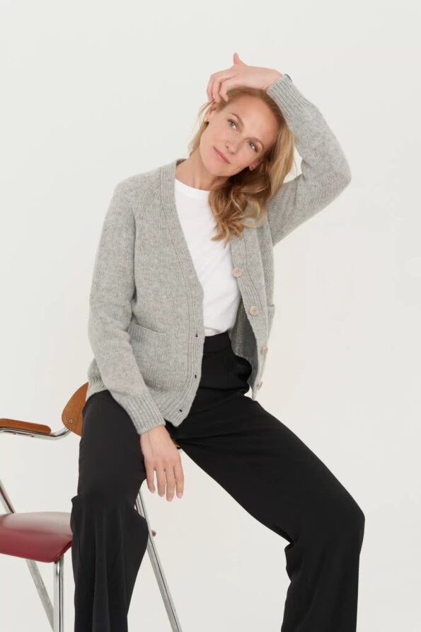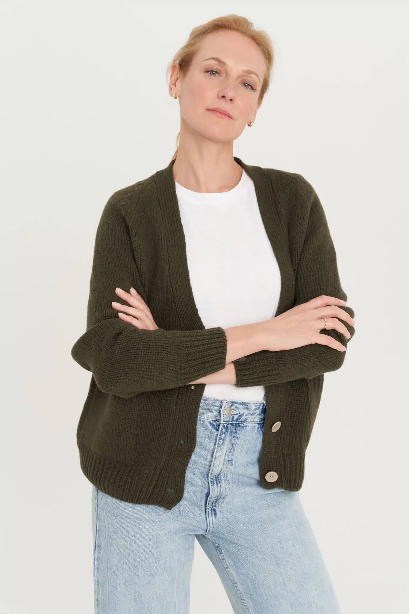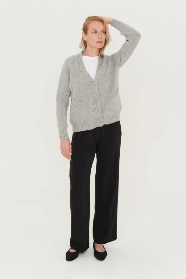 - Simple modern women??s sweater has minimalist buttons and two patched pockets